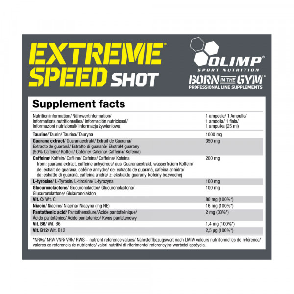 La caja Extreme speed shot (9X25ml) contiene 9 shots pre-entrenamiento, cada uno de 25ml, de la famosa marca Olimp Sport Nutrition.