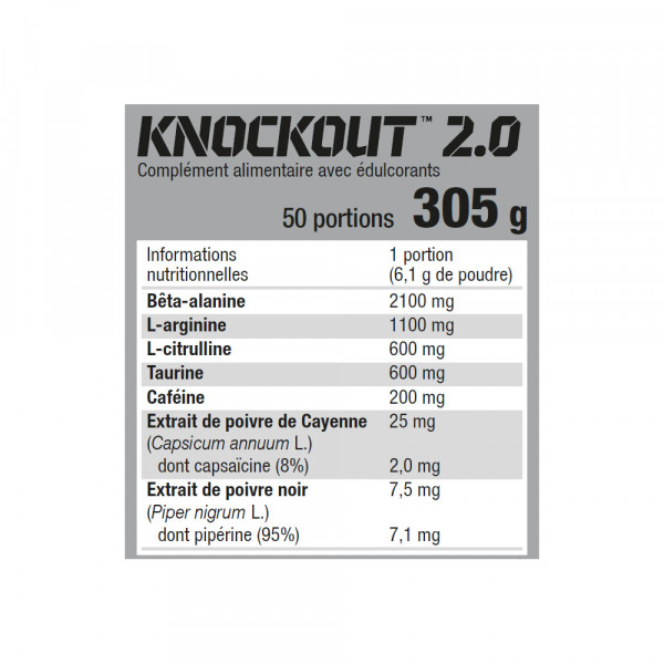 Knockout 2.0 (305 g) contiene una alta dosis de beta-alanina (2100 mg) y L-arginina (1100 mg), así como L-citrulina (600 mg), taurina (600 mg) y cafeína (200 mg por dosis). La fórmula se completa con extractos de plantas (pimienta de cayena y pimienta negra). Esta sinergia le proporcionará la energía y la resistencia muscular que necesita para superar sus objetivos