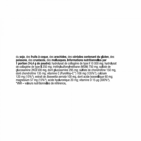 Ingredientes: hidrolizado de colágeno de tipo I, reguladores de la acidez: ácido cítrico, citratos de sodio; metilsulfonilmetano (MSM), aromas, sulfato de glucosamina 2KCl (de crustáceos), antiaglomerante: dióxido de silicio; carbonato de calcio, hidrolizado de colágeno de tipo II, sulfato de condroitina, ácido L-ascórbico microencapsulado (PureWay-C®) - vit. C, extracto de Boswellia serrata (resina de Boswellia serrata de Roxb. ex Colebr.), óxido de magnesio, edulcorantes: acesulfamo-K, sucralosa; hialuronato sódico, colecalciferol - vit. D3, colorantes: carotenos vegetales (PARFUM ORANGE), carmín (PARFUM PAMPLEMOUSSE).