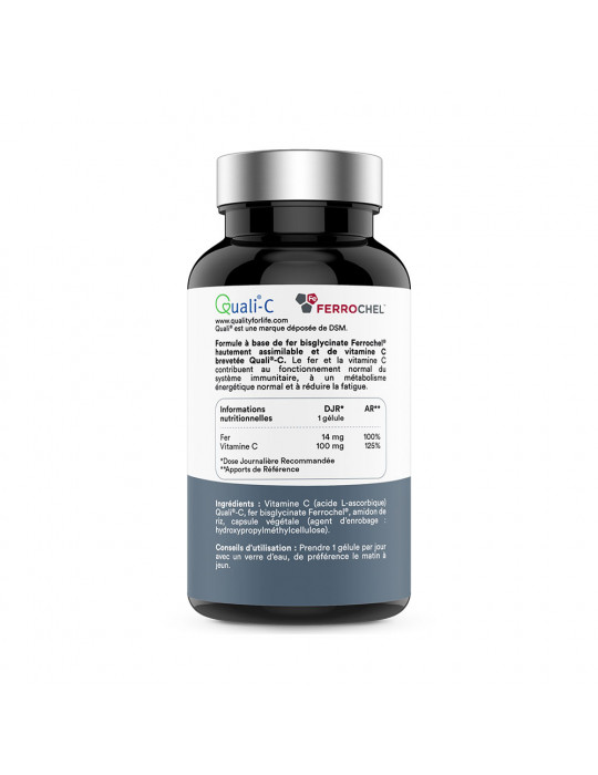 Ingredientes: Vitamina C (ácido L-ascórbico) Quali®-C, bisglicinato de hierro Ferrochel®, almidón de arroz, cápsula vegetal (agente de recubrimiento: hidroxipropilmetilcelulosa).