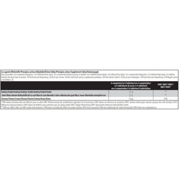 Además, contiene 19 µg de cromo por dosis, lo que representa el 47% de la ingesta diaria recomendada. El objetivo del cromo es contribuir al metabolismo normal de los macronutrientes y mantener niveles normales de azúcar en sangre.