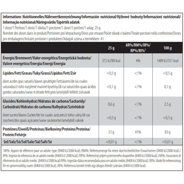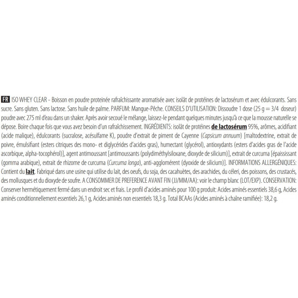 Su alto contenido en proteínas(20-21 g por dosis dependiendo del sabor) ayuda a aumentar y mantener la masa muscular, así como a mantener una estructura ósea normal. Además, Iso whey clear (1,02 kg) contiene 9,65 g por dosis de aminoácidos esenciales (EAA), incluidos 4,55 g por dosis de BCAA, ideales para mejorar la recuperación después del entrenamiento.