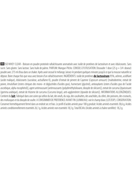 Iso Whey clear no contiene azúcar, lactosa, gluten ni aceite de palma, lo que acelera su absorción en el organismo, además de su textura más ligera que la del suero tradicional. Esto la convierte en una excelente alternativa para una refrescante bebida proteica.