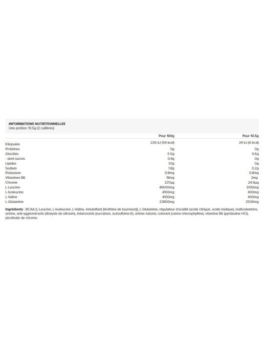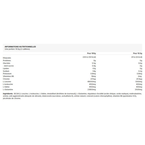 Ingredientes: [L-Leucine, L-Isoleucine, L-Valine, émulsifiant (lécithine de tournesol)] BCAA , L-Glutamina, regulador de la acidez (ácido cítrico, ácido málico), maltrodextrina, aroma, antiaglomerantes (dióxido de silicio), edulcorantes (sucralosa, acesulfamo-K), aroma natural, colorante (cobre-clorofilina), vitamina B6 (piridoxina HCl), picolinato de cromo.