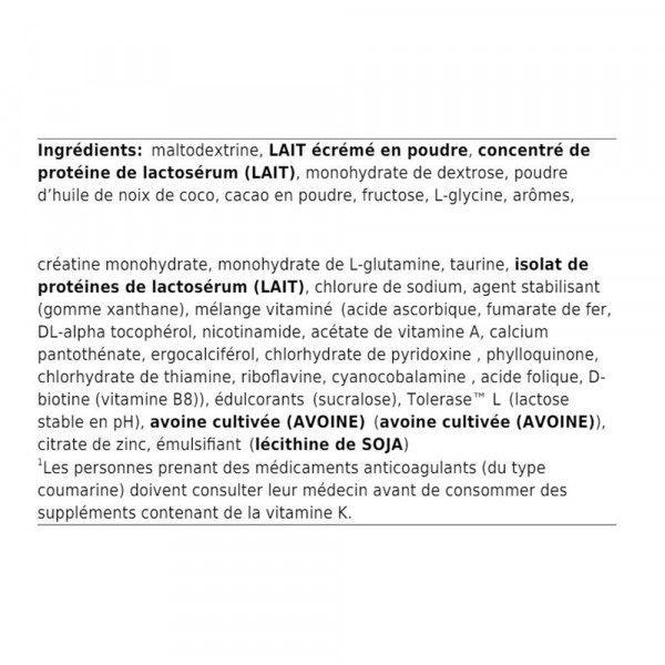 Ingredientes del chocolate: maltodextrina, leche desnatada en polvo, concentrado de proteína de suero(leche), dextrosa monohidrato, aceite de coco en polvo, cacao en polvo, fructosa, L-glicina, aromas, creatina monohidrato, L-glutamina monohidrato, taurina, [acide ascorbique, fumarate de fer, DL-alpha tocophérol, nicotinamide, acétate de vitamine A, calcium pantothénate, ergocalciférol, chlorydrate de pyridoxine, phylloquinone, chlorhydrate de thiamine, riboflavine, cyanocobalamine, acide folique, D-biotine (vitamine B8)] aislado de proteína de suero(leche), cloruro sódico, estabilizador (goma xantana), mezcla de vitaminas , edulcorante (sucralosa), Tolerase L (lactosa con pH estable),avena cultivada, citrato de zinc, emulgente (lecitina de soja).