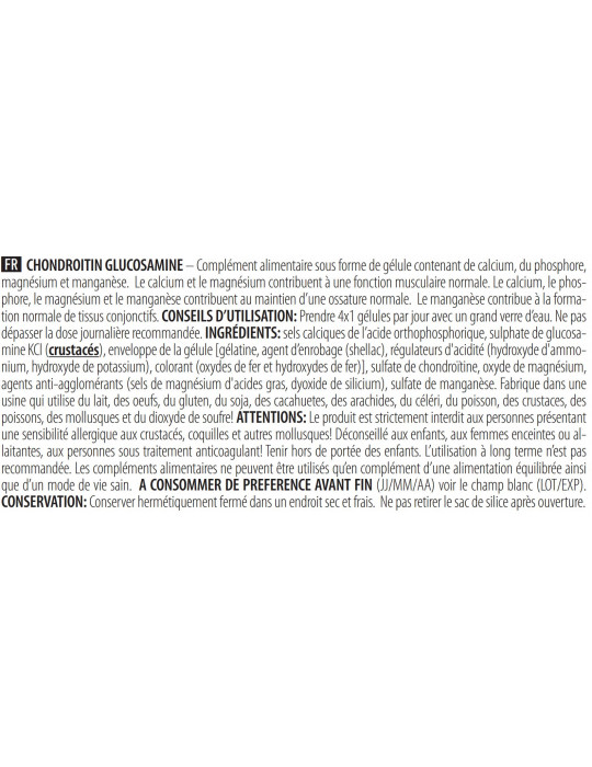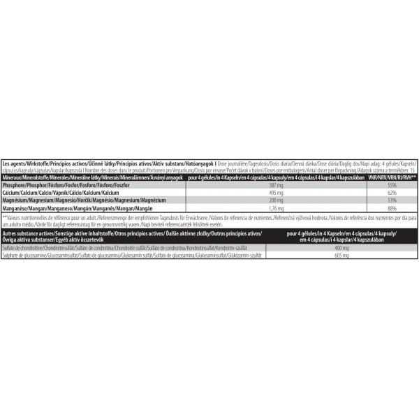 La fórmula de Condroitina glucosamina también contiene minerales esenciales como calcio (428 mg), magnesio (84 mg) y manganeso (5,0 g ), que contribuyen al mantenimiento de huesos y articulaciones, además de ayudar al buen funcionamiento del organismo.