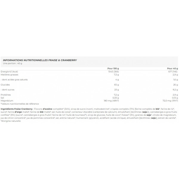 Ingredientes Fresa Arándano: Copos de avena integral* (34%), jarabe de azúcar invertido, maltodextrina*, crujientes integrales (11%) [harina integral de trigo*, harina de arroz*, azúcar*, harina de cebada malteada*, harina de trigo malteada*, sal, aceite de colza*, regulador de la acidez (carbonato cálcico), emulgente (lecitina desoja)], arándanos rojos confitados de frutos grandes* (9%) [azúcar*, arándanos rojos de fruto grande*, harina de arroz*, aceite de girasol*), jarabe de glucosa, aceite de coco*, fresas* (3%), soja*, citrato de magnesio, zumo de limón concentrado*, zumo de manzana concentrado*, sal, aroma natural*, humectante (glicerol), acidulante (ácido cítrico), emulgente (lecitinas desoja), extracto de vainilla*. *de origen natural.