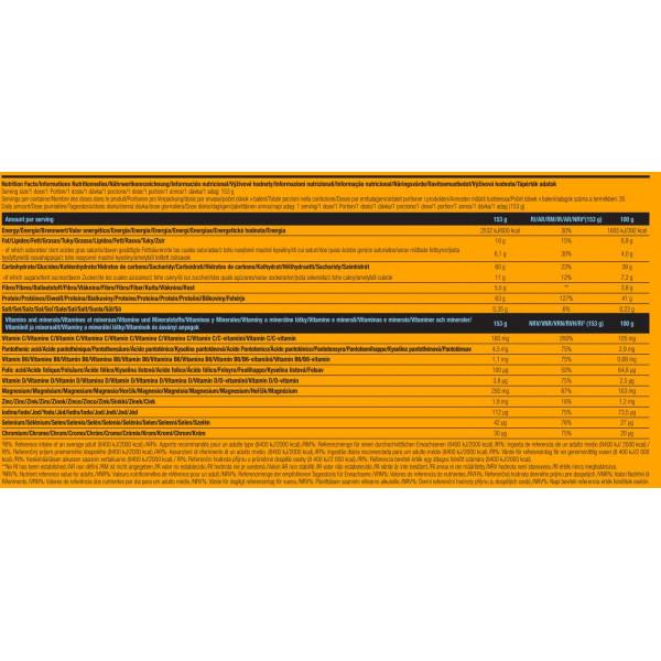 Este gainer contiene 5 fuentes de proteínas de absorción rápida a lenta (suero de leche, aislado de suero de leche, caseína micelar, péptidos de proteínas de vacuno hidrolizadas, proteína de arroz), 7 tipos de hidratos de carbono para un almacenamiento óptimo de glucógeno (avena, modcarb, ciclo-dextrina, palatinosa, maíz céreo, maltodextrina y dextrosa), una matriz de 6 creatinas incluyendo CreaPep, que favorece la secreción de insulina y por lo tanto el almacenamiento de creatina en el músculo.