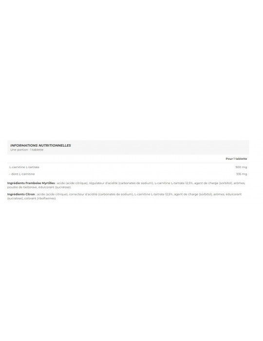Ingredientes Arándano Frambuesa: ácido (ácido cítrico), regulador de la acidez (carbonatos de sodio), L-carnitina L-tartrato 12,5%, agente de carga (sorbitol), aromas, remolacha en polvo, edulcorante (sucralosa).