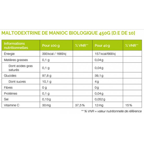 La maltodextrina es una fuente de hid ratos de carbono con la particularidad de absorberse y asimilarse rápidamente. En este producto encontrará 39,1 g de hidratos de carbono por porción, que le aportarán la energía necesaria para su sesión de resistencia.