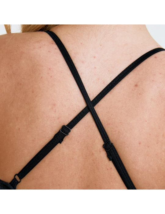 Su escote en pico y sus tirantes ajustables cruzados en la espalda permiten que el sujetador se adapte a los movimientos de la piel, estilizando los hombros y el pecho. De tacto ultrasuave, este top deportivo está provisto de copas acolchadas desmontables para una buena sujeción y un efecto push-up.