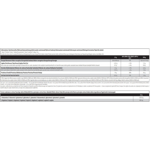 Ingredientes vainilla: proteína de suero hidrolizada instantánea 85% [aislado de proteína de suero hidrolizada, emulgente: lecitina(soja)], aromas, L-glutamina 5,2%, L-arginina 1,7%, sal, edulcorantes (sucralosa, acesulfamo K)
