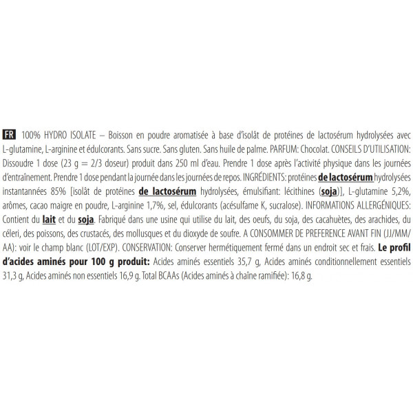 Ingredientes del chocolate: proteína de suero hidrolizada instantánea 85% [aislado de proteína de suero hidrolizada, emulgente: lecitina(soja)], L-glutamina 5,2%, aromas, cacao en polvo bajo en grasa, L-arginina 1,7%, sal, edulcorantes (acesulfamo K, sucralosa).