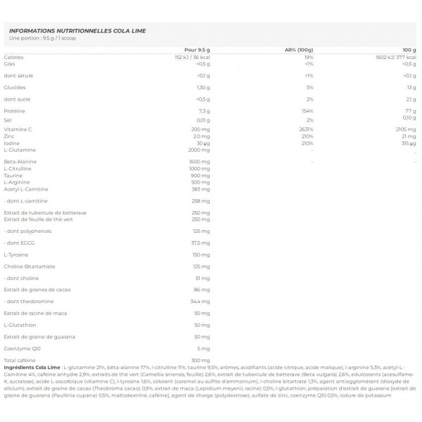 Ingredientes Cola Lima : L-glutamina 21%, beta-alanina 17%, l-citrulina 11%, taurina 9,5%, aromas, acidulantes (ácido cítrico, ácido málico), l-arginina 5,3%, acetil-L-carnitina 4%, cafeína anhidra 2,9%, extracto de té verde (Camellia sinensis, hoja) 2,6%, extracto de remolacha (Beta vulgaris) 2,6%, edulcorantes (acesulfamo-K, sucralosa), ácido L-ascórbico (vitamina C), l-tirosina 1,6%, colorante (caramelo de sulfito amónico), l-bitartrato de colina 1,3%, antiaglomerante (dióxido de silicio), extracto de semilla de cacao (Theobroma cacao) 0,9%, extracto de maca (Lepidium meyenii, raíz) 0,5%, l-glutatión, preparado de extracto de guaraná [extrait de graine de guarana (Paullinia cupana) 0,5%, maltodextrine, caféine], agente de carga (polidextrosa), sulfato de zinc, coenzima Q10 0,5%, yoduro de potasio