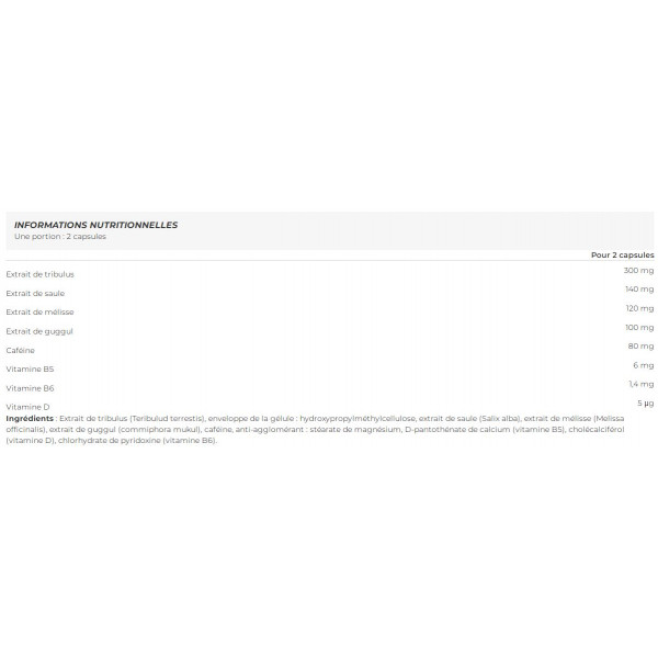 Ingredientes: Extracto de tribulus (Teribulud terrestis), cubierta de la cápsula: hidroxipropilmetilcelulosa, extracto de sauce (Salix alba), extracto de melisa (Melissa officinalis), extracto de guggul (commiphora mukul), cafeína, antiaglomerante: estearato de magnesio, D-pantotenato cálcico (vitamina B5), colecalciferol (vitamina D), clorhidrato de piridoxina (vitamina B6).