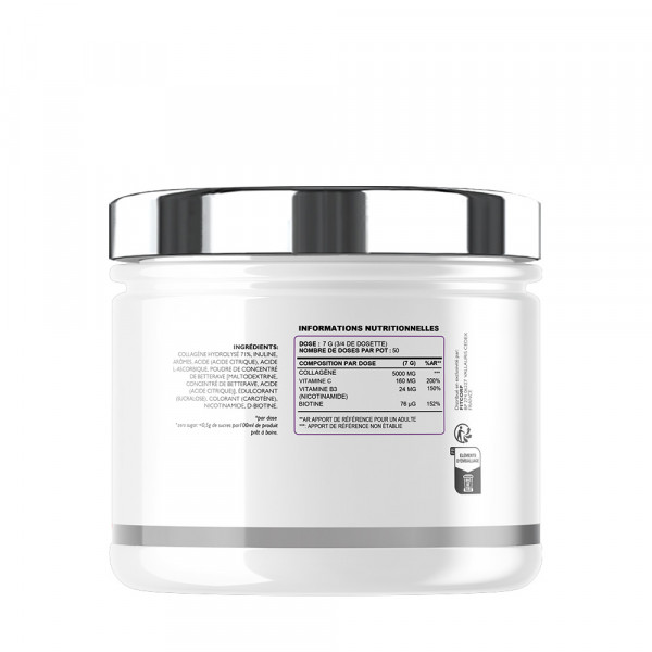 [maltodextrine, concentré de betterave, acide (acide citrique)]Ingredientes: Peptan 71% colágeno hidrolizado, inulina, aromas, acidulante (ácido cítrico), ácido l-ascórbico, concentrado de remolacha en polvo , edulcorante (sucralosa), colorante (caroteno), nicotinamida, d-biotina.