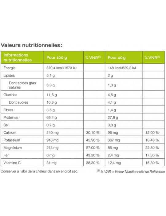 Peso neto : 450 gEn una coctelera: Mezclar 40 g (4 cucharadas soperas colmadas) con 250 ml de líquido (agua, leche vegetal o animal). Agitar bien la coctelera, yendo y viniendo.