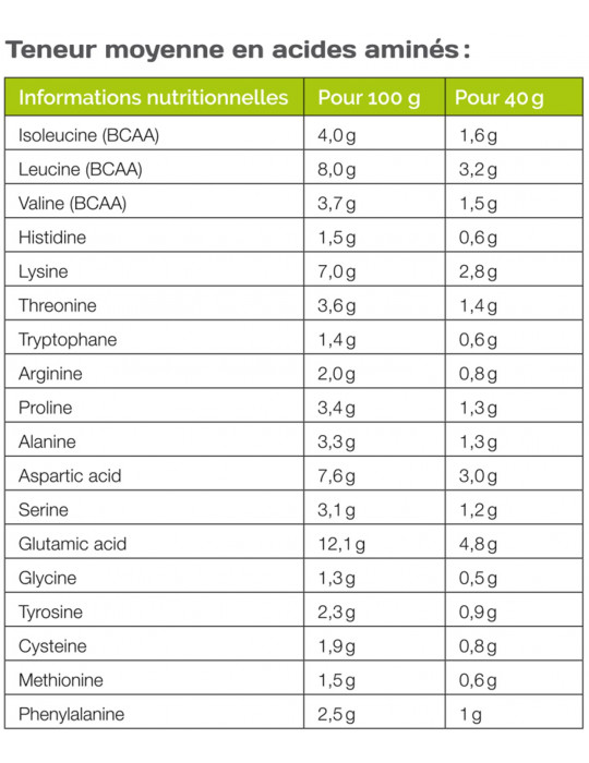 Contenido en aminoácidos : - isoleucina (BCAA) - Leucina (BCAA) - Valina (BCAA) - Histidina - Lisina - Treonina - Triptófano - Arginina - Prolina - Alanina - Ácido aspártico - serina - ácido glutámico - glicina - tirosina - cisteína - metionina - fenilalanina | 4,0 g 8,0 g 3,7 g 1,5 g 7,0 g 3,6 g 1,4 g 2,0 g 3,4 g 3,3 g 7,6 g 3,1 g 12,1 g 1,3 g 2,3 g 1,9 g 1,5 g 2,5 g | 1,6 g 3,2 g 1,5 g 0,6 g 2,9 g 1,4 g 0,6 g 0,8 g 1,3 g 1,3 g 3,0 g 1,2 g 4,8 g 0,5 g 0,9 g 0,8 g 0,6 g 1,0 g |