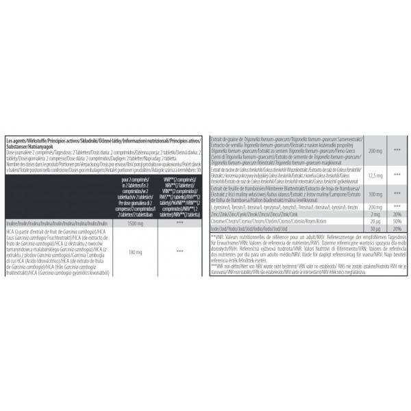 Ingredientes: {stabilisants [copolymère greffé d’alcool polyvinylique et de polyéthylèneglycol, alcool polyvinylique], anti-agglomérants (talc, mono- et diglycérides d’acides gras), colorant (oxydes de fer et hydroxydes de fer)} Inulina 39%, agente de carga (gel de celulosa), extracto de fruto de Garcinia cambogia 7,7%, extracto de semilla de fenogreco (Trigonella foenum-graecum) 6,5%, L-tirosina 5,2%, recubrimiento , extracto de raíz de coleus indio (Coleus forskohlii) 3,2%, extracto de hoja de frambuesa (Rubus idaeus) 2,7%, antiaglomerante (sales magnésicas de ácidos grasos, dióxido de silicio), óxido de cinc, cloruro de cromo (III), yoduro de potasio.