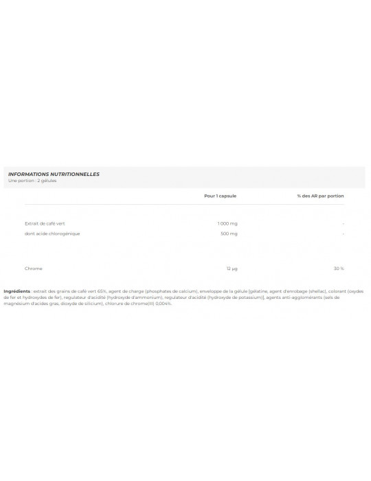 [gélatine, agent d'enrobage (shellac), colorant (oxydes de fer et hydroxydes de fer), régulateur d'acidité (hydroxyde d'ammonium), régulateur d'acidité (hydroxyde de potassium)]Ingredientes: extracto de grano de café verde 65%, agente de carga (fosfatos de calcio), cubierta de la cápsula , antiaglomerantes (sales magnésicas de ácidos grasos, dióxido de silicio), cloruro de cromo(III) 0,004%.