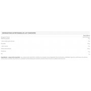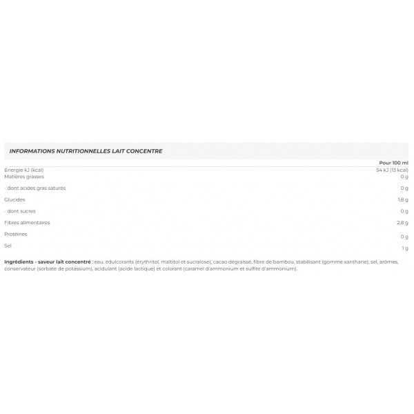 Ingredientes - sabor leche condensada: agua, edulcorantes (eritritol, maltitol y sucralosa), cacao desgrasado, fibra de bambú, estabilizante (goma xantana), sal, aromas, conservante (sorbato potásico), acidulante (ácido láctico) y colorante (caramelo amónico y sulfito amónico).