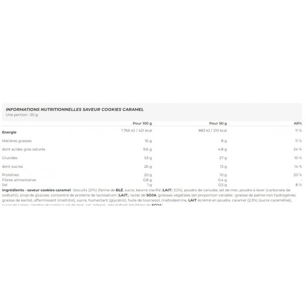 Ingredientes - sabor galleta de caramelo: galletas (21%) (harina de TRIGO, azúcar, mantequilla clarificada(LECHE) (GHE), garrofín en polvo, sal marina, gasificante (carbonato sódico)), jarabe de glucosa, concentrado de proteínas LACTOSERUM(LECHE), aislado de soja, grasas vegetales (en proporciones variables : grasa de palma no hidrogenada, grasa de karité), agente endurecedor (maltiitol), azúcar, humectante (glicerol), aceite de girasol, maltodextrina, LECHE desnatada en polvo, caramelo (2,3%) (azúcar caramelizado), azúcar de caña, almidón de tapioca, sal marina, sal, aromas, emulgente (lecitina de SOJA)