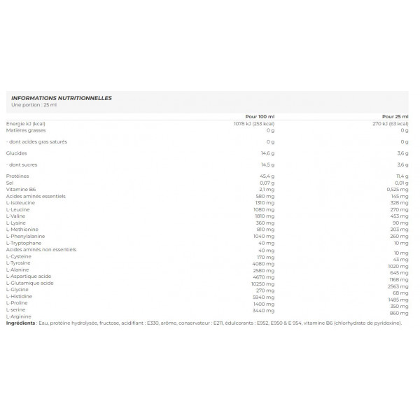 Además de estos aminoácidos, esta bebida también contiene BCAA de origen natural y está enriquecida con vitamina B6. La vitamina B6 contribuye al metabolismo energético normal, al metabolismo normal de las proteínas y del glucógeno, así como a reducir la fatiga.
