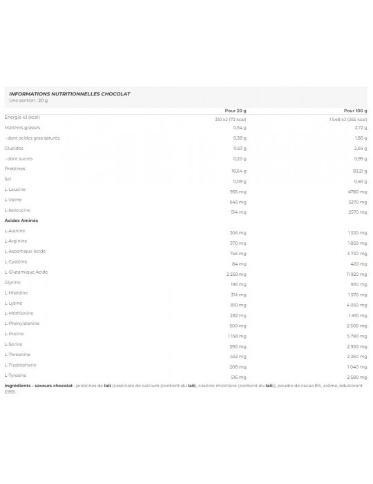 Ingredientes - Sabor chocolateProteínas leche (caseinato de calcio (contiene leche), caseína micelar (contiene leche)), cacao en polvo 8%, aroma, edulcorante E955.