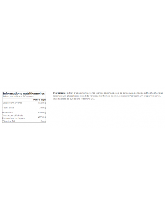 Ingredientes: extracto de Equisetum arvense (partes aéreas), sales potásicas de ácido ortofosfórico (fosfato dipotásico), extracto de Taraxacum officinale (raíz), extracto de Petroselinum crispum (semilla), clorhidrato de piridoxina (vitamina B6).