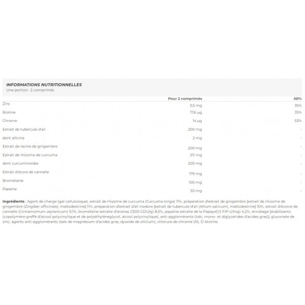 Ingredientes: Agente de carga (gel de celulosa), extracto de rizoma de cúrcuma (Curcuma longa) 11%, preparado de extracto de jengibre [extrait de rhizome de gingembre (Zingiber officinale), maltodextrine] 11%, preparado de extracto de ajo inodoro [extrait de tubercule d’ail (Allium sativum), maltodextrine] 10%, extracto de corteza de canela (Cinnamomum zeylanicum) 9,1%, bromelina extraída de piña (1200 GDU/g) 8,5%, papaína extraída de papaya (1,5 FIP U/mg) 4,2%, recubrimiento [stabilisants (copolymère greffé d’alcool polyvinylique et de polyéthylèneglycol, alcool polyvinylique), anti-agglomérants (talc, mono- et diglycérides d’acides gras)], gluconato de zinc, antiaglomerantes (sales magnésicas de ácidos grasos, dióxido de silicio), cloruro de cromo (III), D-biotina.