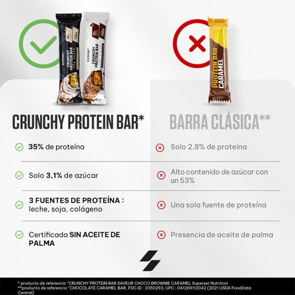 Ingredientes Choco Brownie Caramel : chocolate con leche entera y edulcorante (edulcorante (maltitol), manteca de cacao, leche entera en polvo, pasta de cacao, emulgente (lecitina), aroma natural de vainilla bourbon) 26,7%, proteínas de leche( aislado desuero, caseinato de calcio), relleno con sabor a caramelo (agente de carga (polidextrosa), edulcorante (maltitol), grasa vegetal no hidrogenada (aceite de coco, manteca de karité), manteca de cacao, colorante alimentario (concentrado de manzana e hibisco), emulgente (lecitina), sal, aroma natural) 12,5%, humectante (glicerol), proteína láctea (proteína láctea, hidrolizado de proteína láctea), crujientes de proteína de soja (aislado de proteína de soja, cacao en polvo, almidón de tapioca) 8,33%, hidrolizado de colágeno (bovino), agua, chocolate negro con edulcorante (pasta de cacao, edulcorante (maltitol), manteca de cacao, emulgente (lecitina), aroma natural de vainilla bourbon) 2,50%, cacao en polvo bajo en grasa, aroma, celulosa microcristalina, sal.