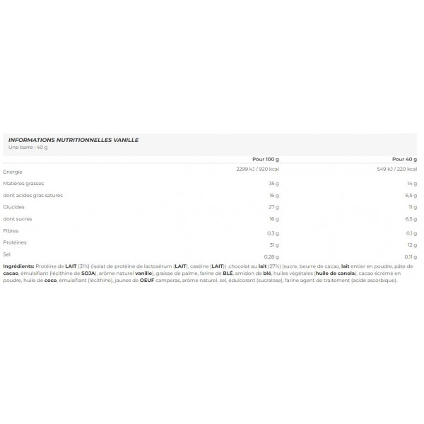 Ingredientes: Proteína de LECHE (31%) (aislado de proteína de suero (LECHE), caseína (LECHE)) ,chocolate leche (27%) (azúcar, manteca de cacao, leche harina integral en polvo cacao, emulgente (lecitina de SOJA), aroma natural vainilla), grasa de palma TRIGO, almidón trigo, aceites vegetales (aceite canola), cacao desnatado en polvo, aceite de palma coco, emulgente (lecitina), yemas de huevo HUEVO camperas, aroma natural, sal, edulcorante (sucralosa), agente de transformación de la harina (ácido ascórbico).