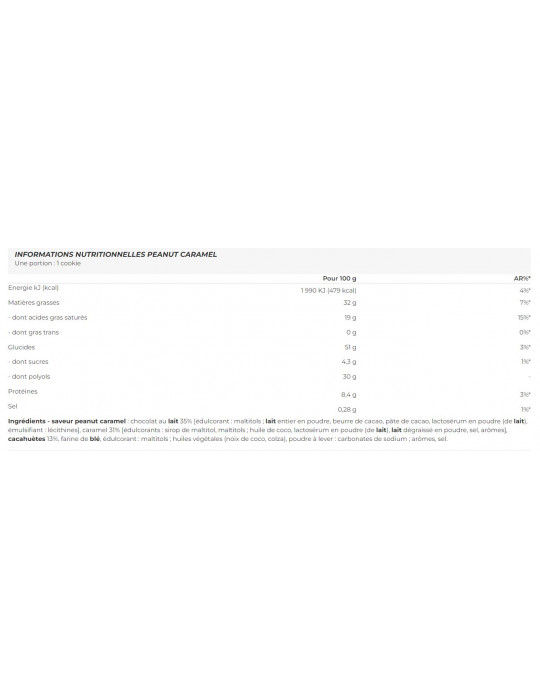 Ingredientes - sabor a caramelo de cacahuete: chocolate con leche 35% [edulcorante: maltitoles; leche entera en polvo, manteca de cacao, pasta de cacao, suero en polvo (de leche), emulgente: lecitinas], caramelo 31% [edulcorantes: jarabe de maltitol, maltitoles; aceite de coco, suero de leche en polvo (de leche), leche desnatada en polvo, sal, aromas], cacahuetes 13%, harina de trigo, edulcorante: maltitoles; aceites vegetales (coco, colza), gasificante: carbonatos de sodio; aromas, sal.