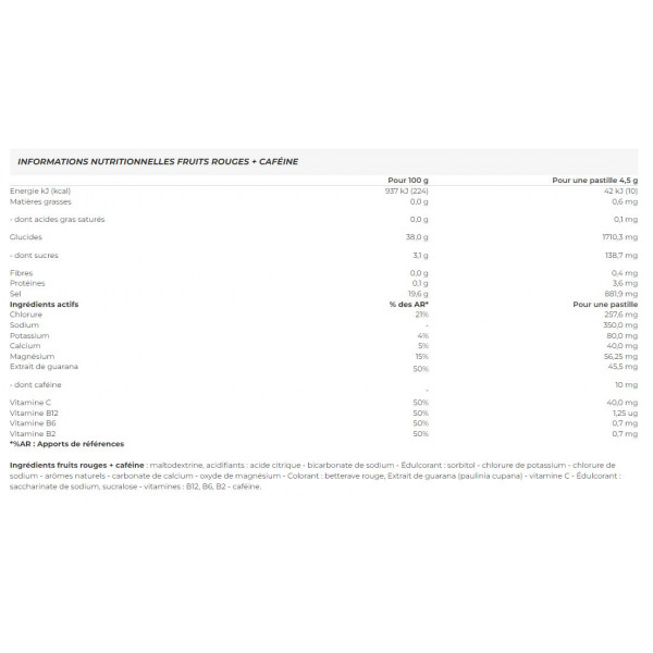 Ingredientesbayas rojas + cafeína Maltodextrina, acidulantes: ácido cítrico - bicarbonato sódico - edulcorante: sorbitol - cloruro potásico - cloruro sódico - aromas naturales - carbonato cálcico - óxido magnésico - colorante: remolacha, extracto de guaraná (paulinia cupana) - vitamina C - edulcorante: sacarinato sódico, sucralosa - vitaminas: B12, B6, B2 - cafeína.