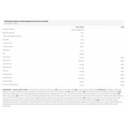 Ingredientes - sabor galleta blanca mezcla de proteínas (proteínas de leche, aislado de proteína soja, concentrado de proteínas suero de leche), colágeno hidrolizado (vacuno), humectante (glicerol), chocolate blanco (14%) (edulcorante (maltitol), manteca de cacao, leche polvo entero, leche Polvo desnatado, emulgente (lecitina de soja), Aroma de vainilla), Agente de carga (Polidextrosa), Grasa vegetal (Coco), Gotas de chocolate blanco (4,5%) (Manteca de cacao, Edulcorante (Xylit), Leche harina integral en polvo, Leche leche desnatada en polvo, grasa butírica, emulgente (lecitina de girasol), aroma natural de vainilla bourbon), trozos de masa quebrada de cacao (3%) (harina de trigo, azúcar, grasa vegetal (palma), cacao en polvo (9%), jarabe de glucosa-fructosa, leche polvo desnatado, sal, aroma natural de vainilla, vaina de vainilla en polvo, gasificante (bicarbonato sódico, bicarbonato amónico), aroma, emulgente (lecitina sódica) soja), aroma (vainillina), ácido L-ascórbico (vitamina C), acetato de tocoferol (vitamina E), nicotinamida (niacina), antioxidante (DL-alfa-tocoferol), D-pantotenato cálcico, Clorhidrato de piridoxina (vitamina B6), Riboflavina (vitamina B2), Mononitrato de tiamina (vitamina B1), Ácido fólico, D-biotina, Cianocobalamina (vitamina B12), Edulcorante (Sucralosa).