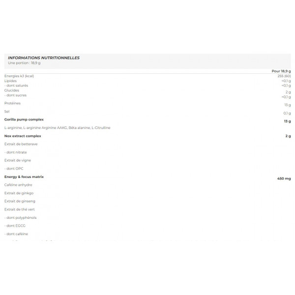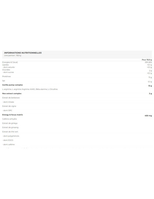 Gorilla Pump Complex contiene 1.500 mg de citrulina, 1.500 mg de beta-alanina y 1.000 mg de L-arginina. Esto ayuda a mejorar la vasodilatación, ya que la citrulina y la arginina son dos precursores del óxido nítrico (NO), que mejora la circulación sanguínea durante el ejercicio. Este complejo también ayuda a limitar la fatiga muscular gracias a la beta-alanina, conocida por aumentar los niveles de carnosina en los músculos, reduciendo así la acumulación de ácido láctico y la fatiga muscular. La combinación de estos tres principios activos optimiza la producción de energía, mejora la capacidad durante el entrenamiento y favorece la resistencia.