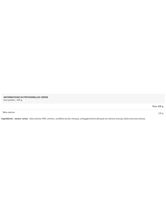 [nano]Ingredientes - aroma de cereza : beta-alanina 94%, aromas, acidulante (ácido cítrico), antiaglomerante (dióxido de silicio ), edulcorante (sucralosa).