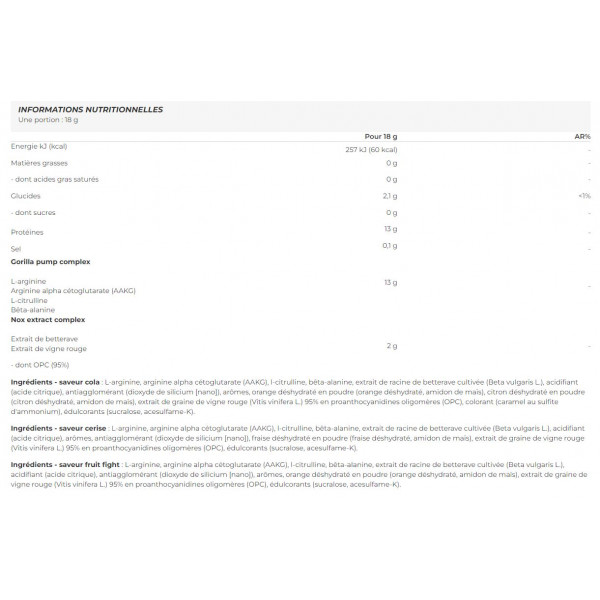 Ingredientes - sabor cereza : L-arginina, alfa-cetoglutarato de arginina (AAKG), l-citrulina, beta-alanina, extracto de remolacha cultivada (Beta vulgaris L. [nano]), acidulante (ácido cítrico), aromas, antiaglomerante (dióxido de silicio ), fresa deshidratada en polvo (fresa deshidratada, almidón de maíz), extracto de semilla de vid roja (Vitis vinifera L.) 95% proantocianidinas oligoméricas (OPC), edulcorantes (sucralosa, acesulfamo-K).