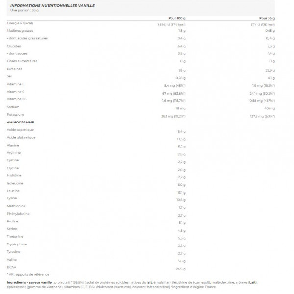 Ingredientes - Sabor vainilla : prolacta® * (95,5%) (aislado de proteína de leche soluble nativa, emulgente (lecitina de girasol)), maltodextrina, aromas(leche), espesante (goma xantana), vitaminas (C, E, B6), edulcorante (sucralosa), colorante (betacaroteno). *ingredientes de origen francés.