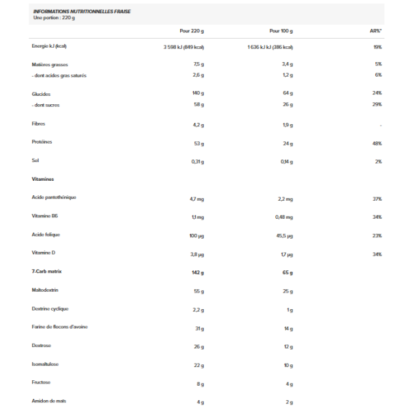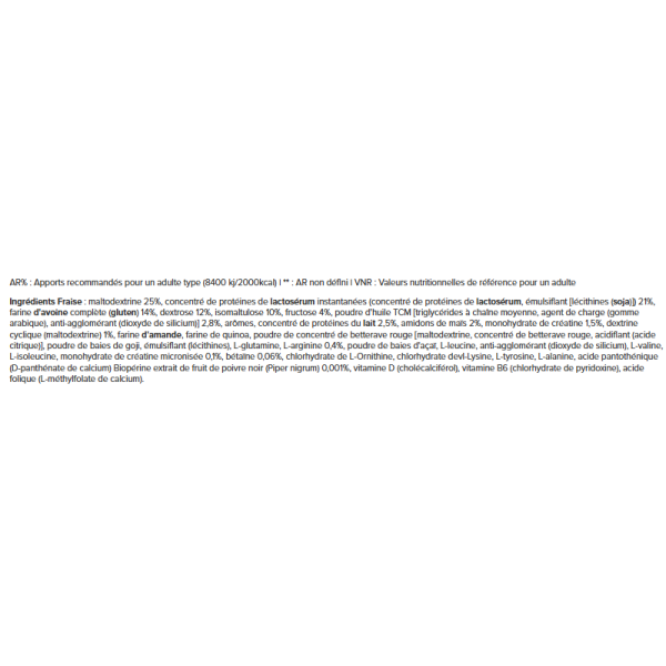Ingredientes fresa: Maltodextrina 22%, Proteína de suero 21% [Concentrado de proteína de suero, Emulgente: Lecitinas(Soja)], Harina de avena(Gluten) 14%, Dextrosa 12%, PalatinoseTM (Isomaltulosa*) 10%, Fructosa 4%, Aceite de triglicéridos de cadena media en polvo 2. [Triglycérides à chaîne moyenne, agent de charge (gomme d'acacia), agent anti-agglomérant (dioxyde de silicium)] [maltodextrine, concentré de betterave, acidifiant (acide citrique)]8% , aromas, proteínaslácteas, almidón de maíz 2%, monohidrato de creatina 1,5%, cluster dextrin® (maltodextrina) 1%, harina de almendras, concentrado de remolacha roja en polvo , quinoa en polvo, bayas de goji en polvo, emulgente (lecitinas), L-Glutamina, L-Arginina 0.4%, carbonato de magnesio, polvo de bayas de Acai, L-leucina, L-valina, L-isoleucina, monohidrato de creatina micronizado 0,1%, betaína 0,06%, L-ornitina HCl, L-lisina HCl, L-tirosina, L-alanina, [Bisglycinate de Zinc, Glycine, Acide (Acide Citrique), Anti-agglomérant (Dioxyde de Silicium)] Bisglicinato de zinc , D-Pantotenato, Calcio, BioPerine® Extracto de fruto de pimienta negra (Piper Nigrum), colecalciferol, clorhidrato de piridoxina, picolinato de cromo, L-metilfolato cálcico.