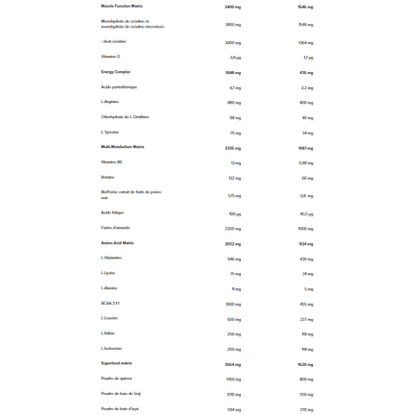Ingredientes de vainilla: Maltodextrina 22%, proteína de suero 21% [concentrado de proteína de suero, emulgente: lecitinas(soja)], harina de avena(gluten) 14%, dextrosa 12%, PalatinoseTM (Isomaltulosa*) 10%, fructosa 4%, aceite de triglicéridos de cadena media en polvo 2. [Triglycérides à chaîne moyenne, agent de charge (gomme d'acacia), agent anti-agglomérant (dioxyde de silicium)]8% , concentrado de proteínaslácteas, aromas, almidón de maíz 2%, monohidrato de creatina 1,5%, cluster dextrin® (maltodextrina) 1%, harina de almendras, quinoa en polvo, bayas de goji en polvo, emulgente (lecitinas), L-Glutamina, L-Arginina 0,4%, carbonato de magnesio, bayas de acai en polvo, L-Leucina, L-Valina, L-Isoleucina, [Bisglycinate de Zinc, Glycine, Acidifiant (Acide Citrique), Anti-agglomérant (Dioxyde de Silicium)] Monohidrato de creatina micronizado 0,1%, betaína 0,06%, colorante (riboflavinas), L-ornitina HCl, L-lisina HCl, L-tirosina, L-alanina, bisglicinato de zinc, D-pantotenato, calcio, BioPerine® extracto de pimienta negra (Piper Nigrum), colecalciferol, clorhidrato de piridoxina, picolinato de cromo, L-metilfolato de calcio.