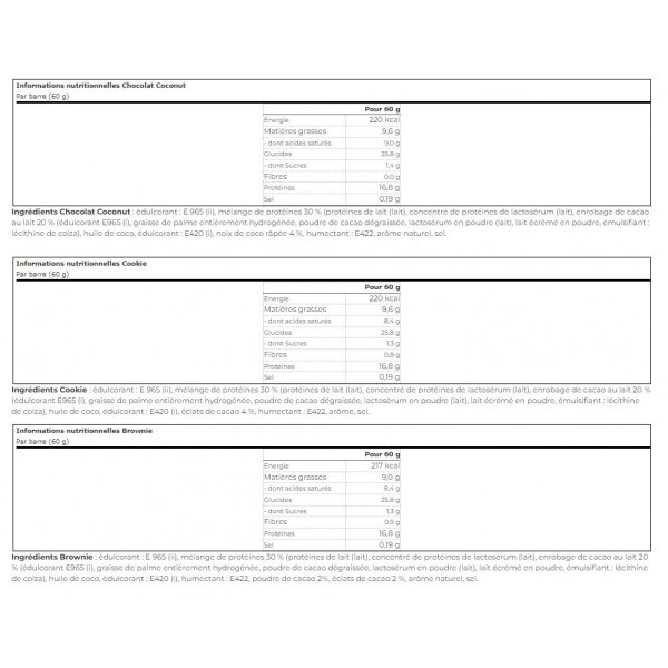 Ingredientes BrownieEdulcorante: E 965 (ii), mezcla de proteínas 30% (proteína de leche (leche), concentrado de proteína de suero (leche), cobertura de cacao con leche 20% (edulcorante E965 (i), grasa de palma totalmente hidrogenada, cacao en polvo desgrasado, suero en polvo (leche), leche desnatada en polvo, emulgente: lecitina de colza), aceite de coco, edulcorante: E420 (i), humectante: E422, cacao en polvo 2%, nibs de cacao 2%, aroma natural, sal.