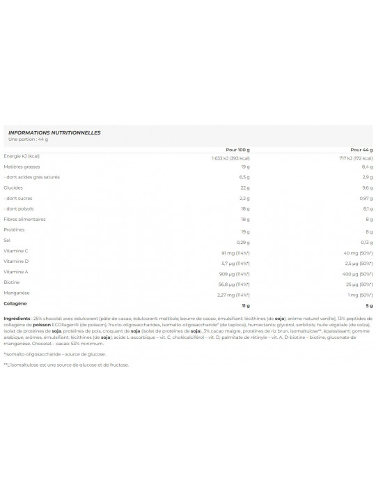Ingredientes: 25% chocolate con edulcorante [pasta de cacao, edulcorante: maltitoles; manteca de cacao, emulgente: lecitinas (de soja); aroma natural de vainilla], 13% péptidos de colágeno de pescado ECOllagen® (de pescado), fructo-oligosacáridos, isomalto-oligosacáridos* (de tapioca), humectantes: glicerol, sorbitoles; aceite vegetal (colza), aislado de proteína de soja, proteína de guisante, crujiente de soja (aislado de proteína de soja), 3% de cacao bajo en grasa, proteína de arroz integral, isomaltulosa**, espesante: goma arábiga; aromas, emulgente: lecitinas (soja); ácido L-ascórbico - vit. C, colecalciferol - vit. D, palmitato de retinol - vit. A, D-biotina - biotina, gluconato de manganeso. Chocolate - cacao: 53% mínimo.