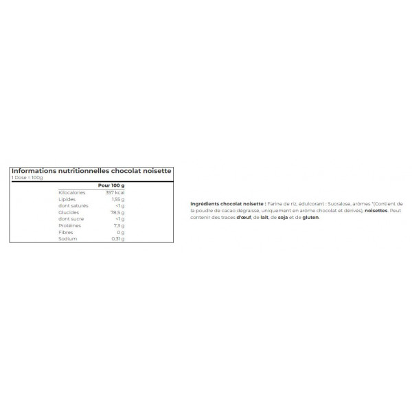 Ingredientes del chocolate con avellanas: Harina de arroz, edulcorante : Sucralosa, aromas *(Contiene cacao en polvo desgrasado, sólo aroma de chocolate y derivados), avellanas. Puede contener trazas de huevo, leche, soja y gluten.