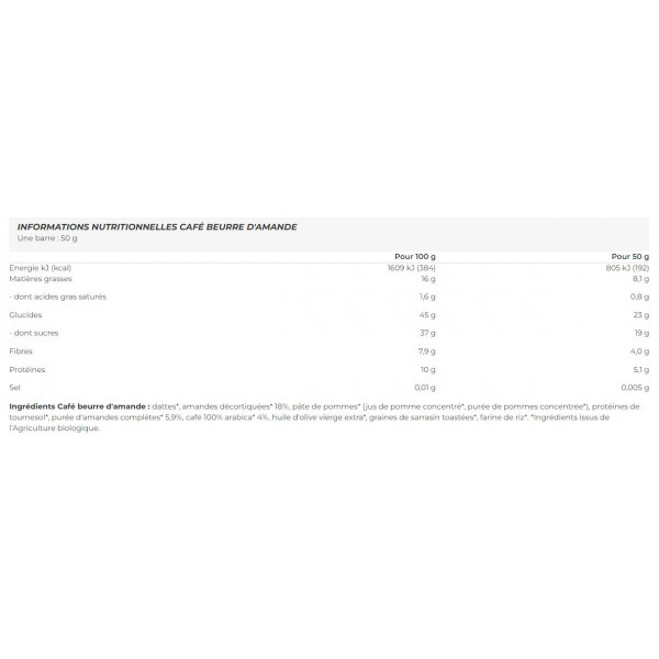 Ingredientes Mantequilla de almendras para café :dátiles*, almendras peladas* 18%, pasta de manzana* (zumo concentrado de manzana*, puré concentrado de manzana*), proteínas de girasol*, puré integral de almendras* 5,9%, café 100% arábica* 4%,aceite de oliva virgen extra*,semillas de alforfón tostadas*, harina de arroz*. *Ingredientes procedentes de la agricultura ecológica.