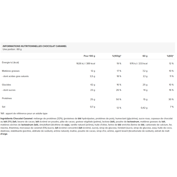 IngredientesChocolate con carameloMezcla de proteínas (32%), (proteínas de trigo proteína de guisante), humectante (glicerina), azúcar moreno, virutas de chocolate leche (9%) (leche, manteca de cacao, leche polvo desnatado, pasta de cacao, grasa vegetal (palma), lactosa (leche), en polvo suero de leche, grasa del leche, materia seca de suero de leche (leche), emulgente (lecitina de soja), vainilla natural (aroma), aceite de oliva, harina de trigo enriquecida (harina de trigo, carbonato cálcico, hierro, niacina, tiamina), trozos de caramelo (5%) (azúcar, leche concentrado desnatado (leche desnatada, azúcar), jarabe de glucosa, fondant (azúcar, jarabe de glucosa, agua), aceite de coco, dextrosa, estabilizantes (pectina, aldinato sódico), aroma natural), inulina, cacao en polvo, jarabe de oro, aroma, gasificante (bicarbonato sódico), extracto de malta cebada.
