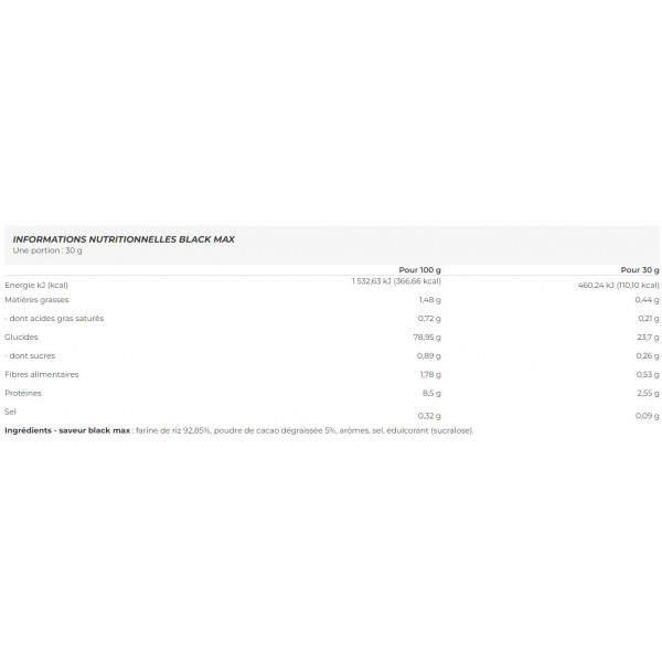 Ingredientes - sabor max negro: 92,85% harina de arroz, 5% cacao desgrasado en polvo, aromas, sal, edulcorante (sucralosa).