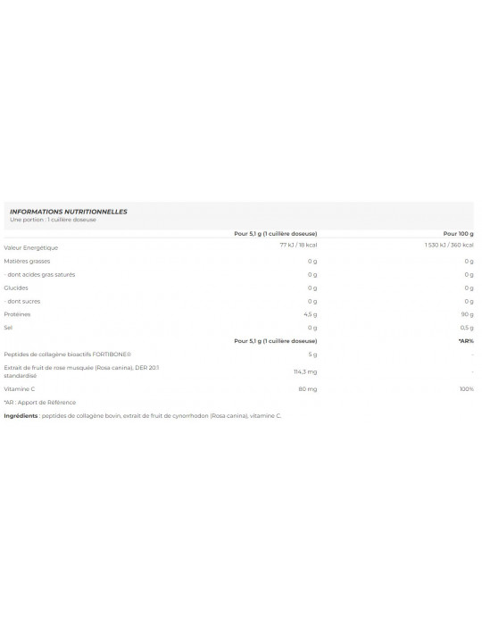 elaborado con FORTIBONE®, péptidos de colágeno bioactivos de origen bovino clínicamente probados. FORTIBONE®, clínicamente probado, estimula la síntesis de la matriz de colágeno ósea, mejora la densidad ósea y favorece la estabilidad y flexibilidad de los huesos.