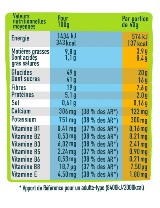 Ingredientes - aroma de frutos rojos arándanos deshidratados azucarados 30% (arándanos 55%, azúcar, aceite de girasol), manzanas deshidratadas 12% (manzanas, conservante : sulfitos), bayas secas de grosella negra infusionadas con zumo de manzana 10% (grosella negra 83%, zumo concentrado de manzana, zumo concentrado de limón, aceite de girasol), pasas sultanas 9,2% (pasas, aceite de girasol), higos secos 8,2% (higos 97%, harina de arroz), mezcla de semillas 8,0% (girasol sin cáscara, lino marrón tostado, calabaza tostada sin sal), fibra de acacia, almendras sin cáscara 5,0%, pasta de dátiles, avellanas cáscara 3,0%, bayas de goji desecadas 2,5%, fibra de manzana, fibra de limón, sal, fosfatos de potasio y calcio, vitaminas (B1, B2, B3, B5, B6, B8, E).