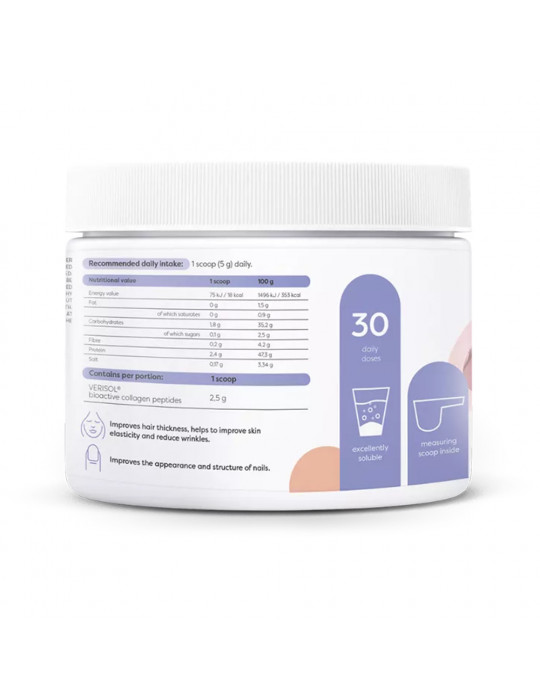 compuesto de colágeno en polvo con VERISOL®, péptidos de colágeno bioactivos clínicamente probados. Es soluble, inodoro e insípido, diseñado para mejorar el grosor del cabello, la elasticidad de la piel y fortalecer las uñas.
